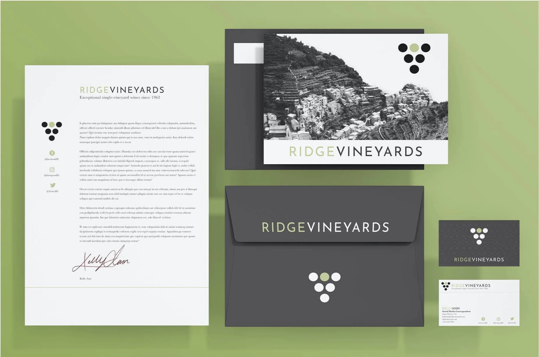 Ridge Vineyards is a hypothetical re-branding that was created throughout an entire semester with the course, Identity Systems. Ridge is a wine distillery located in California that specializes in single-vineyard wines, meaning each batch is from differing vineyards spanning across the state. With this in mind, the current cliental that was already reached with the previous design cannot be forgotten while still moving to a newer and modern consumer base. The design went from a more traditional aesthetic to a more contemporary in hopes to reach this newer audience by changing the logo from a Logo type to an icon/emblem.